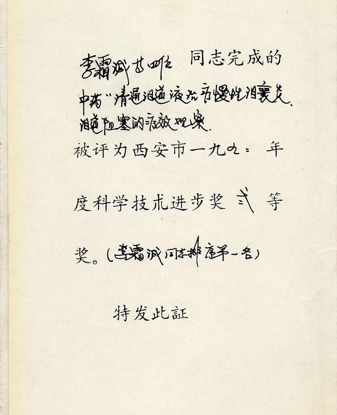 3,李霜诚主任医师研制《清通泪道液》获国家科技成果奖(扫描证书)