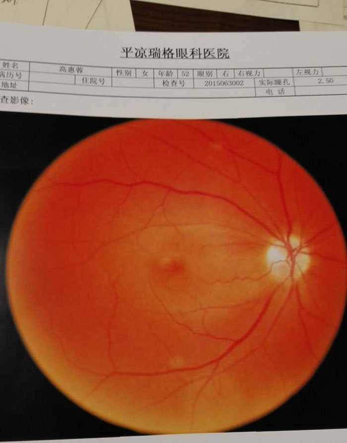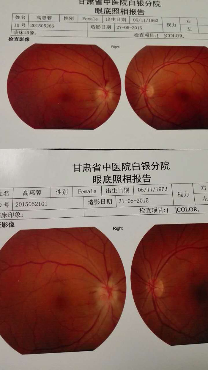 此患者来自甘肃白银,为我同学的弟弟介绍而专程过来治疗。患“右眼视神经炎”,经西医用激素治疗无效,并造成患者记忆力衰退等并发症。在西安李氏眼科吃了一个月的中药,视神经水肿减轻,出血吸收,视力提高到1.0。现在继续用药巩固。