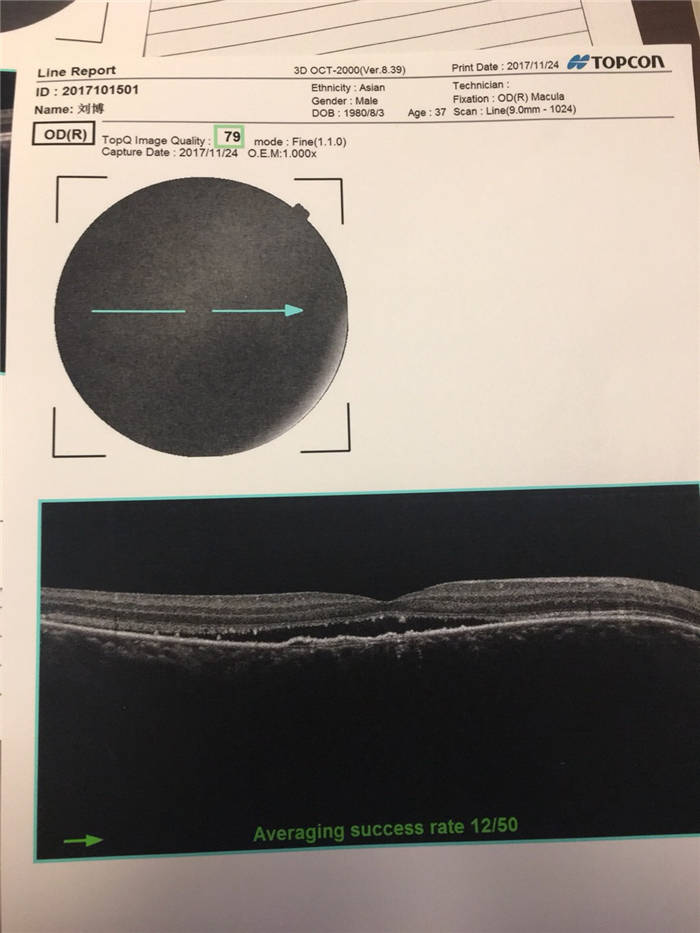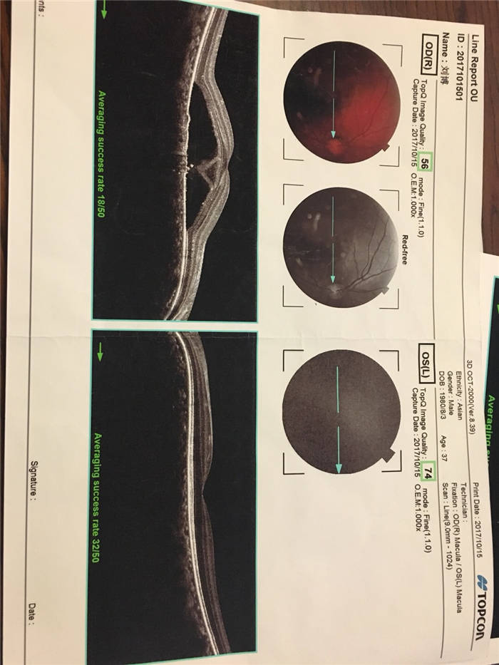 中浆,是眼底病“中心性浆液性视网膜脉络膜炎”的简称,一般多发于三四十岁的青壮年,以男性多见。主要症状是视物模糊、变形,将直线看成曲线,原物体变大变小。病因多由于熬夜,嗜酒,长期看电脑手机所造成。该患者由于左眼小时候弱视,所以主要靠右眼,来前在西京医院检查OCT报告显示:右眼黄斑区水肿明显,来我们这里服用中药17天后,再次报告显示,右眼黄斑水肿明显减轻,患者自我感觉视力有所恢复,看东西变形减轻,现继续接受中药治疗。